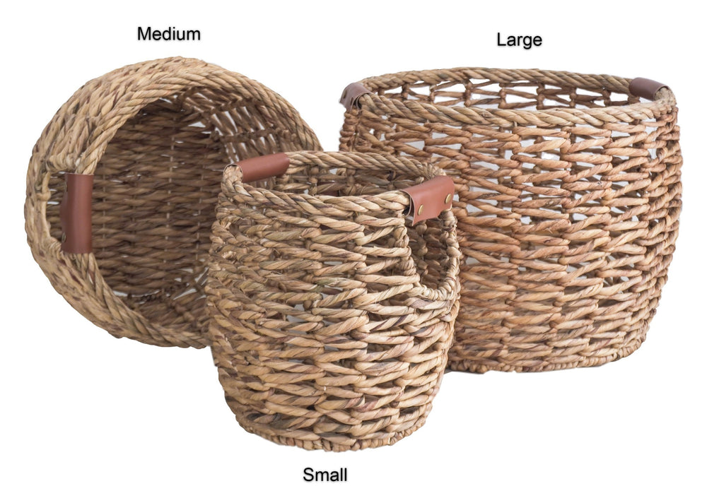 Store your belongings in style with this beautifully handcrafted set of 3 round baskets, designed in small, medium, and large sizes. Each basket is expertly woven in Vietnam from natural dried water hyacinth and finished with cutout handles featuring PU leather hand grips for added style and functionality. Their nestable design makes them easy to store or transport when not in use.