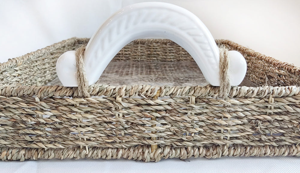 Discover the artistry of Vietnam with this elegant rectangular tray, handcrafted from natural water hyacinth. Designed to combine organic texture with contemporary elegance, this tray features sleek white ceramic handles that bring a refined contrast to its rustic charm. Whether used to serve refreshments or organize daily essentials, it adds warmth and craftsmanship to any space.